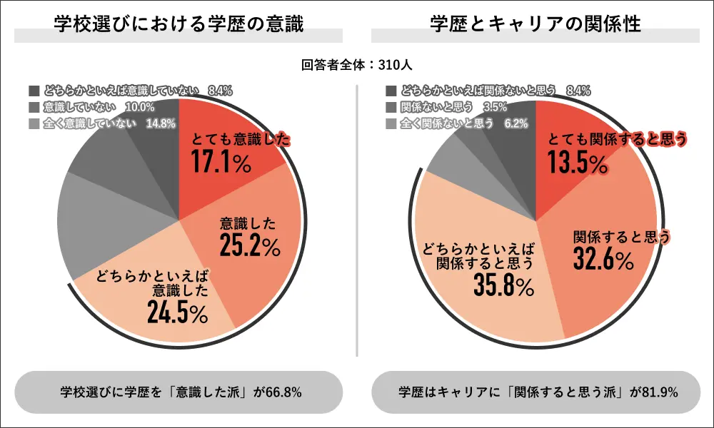 それによると、回答者全体に学校を選ぶ際に学歴を意識したかの問いには、「意識した派」は66.8%で過半数を占め、内訳は「とても意識した」17.1%、「意識した」25.2%、「どちらかといえば意識した」24.5%だった。また、学歴はキャリアに関係すると思うかを聞くと、「関係すると思う派」は 2024年の調査時から1.6%増加した81.9%となり、内訳は「とても関係すると思う」13.5%、「関係すると思う」32.6%、「どちらかといえば関係すると思う」35.8%だった。