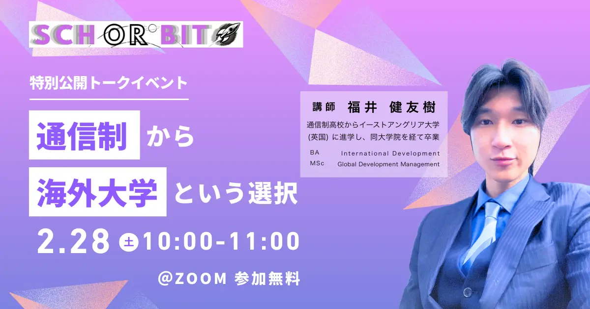 不登校・通信制高校・高校中退者向けのオンライン進学校「シン・ガッコウSchorbit(ショービット)」は、「海外大進学は通信制高校が有利って本当?~経験者が語る実体験~」と題する特別公開トークイベントを2月28日にオンラインで無料開催する。
