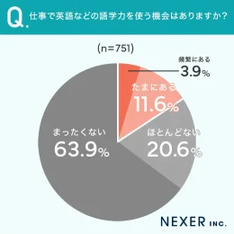 それによると、仕事で英語などの語学力を使う機会があるかについては、「まったくない」が63.9%と最多、次いで「ほとんどない」が20.6%となった。「たまにある」は11.6%、「頻繁にある」はわずか3.9%にとどまっている。