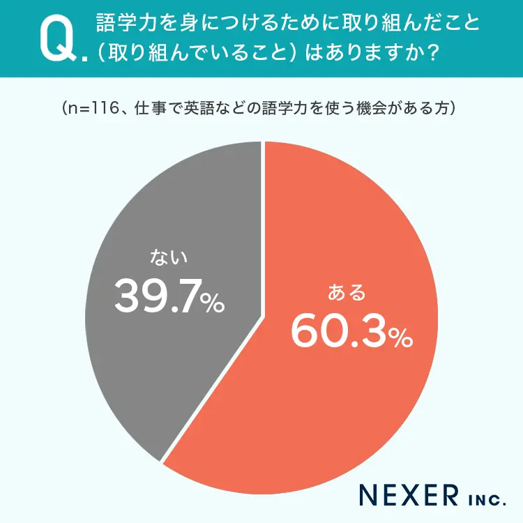 仕事で語学力を使う機会がある人に、語学力を身につけるために取り組んだこと(取り組んでいること)があるかの問いには、「ある」が60.3%、「ない」が39.7%となった。
