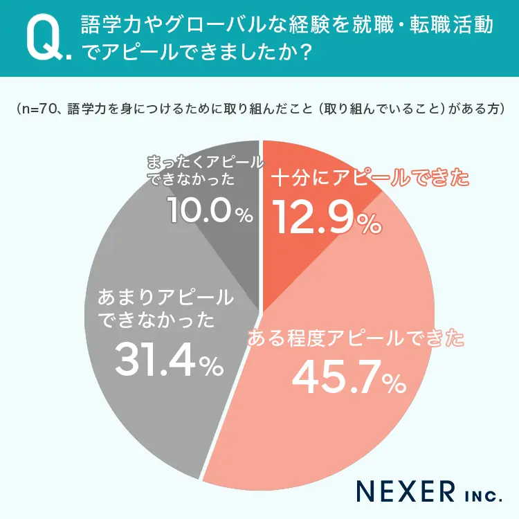 語学力を身につけるための取り組みがある人に、語学力やグローバルな経験を就職・転職活動でアピールできたかを尋ねたところ、「十分にアピールできた」が12.9%、「ある程度アピールできた」が45.7%となり、合わせて58.6%が何らかの形でアピールできたと回答している。一方で「あまりアピールできなかった」は31.4%、「まったくアピールできなかった」は10.0%だった。