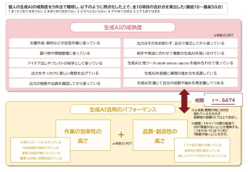 「生成AIの成熟度と組織的活用」に関しては、生成AI成熟度を測る独自の項目を用いて分析した結果、成熟度の高い群は低い群と比較して、利用用途の幅が約2倍、削減時間が約2.3倍となった。