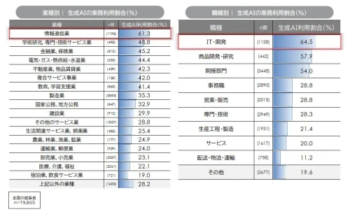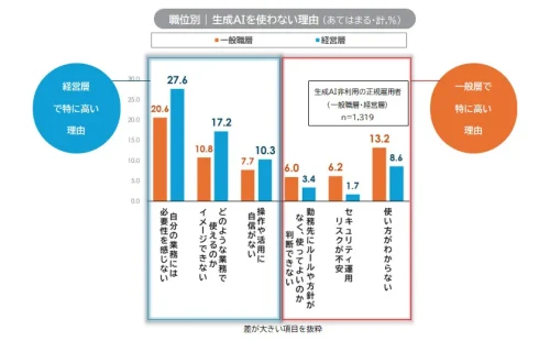 職位別に見ると、課長・部長などの管理職で生成AI利用が高い一方、役員・社長など経営層では利用割合が相対的に低い傾向が見られた。