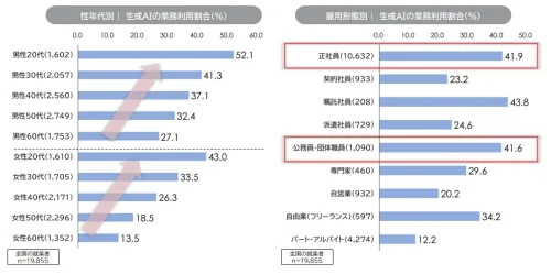 「誰が使っているのか」に関しては、性年代別では若年層ほど生成AI利用が高く、特に20~30代男性は4割超と突出。一方、30代以上の女性や高齢層では利用割合が低く、60代女性では1~2割台にとどまり、世代・性別による利用格差が確認された。