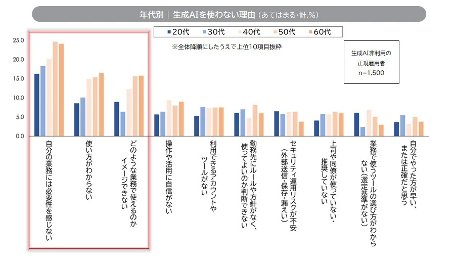 生成AIを使わない理由として、年代共通で上位に挙がるのは「必要性を感じない」「使い方がわからない」「どの業務で使えるかイメージできない」。年代や職位によって使わない要因に違いがみられる。