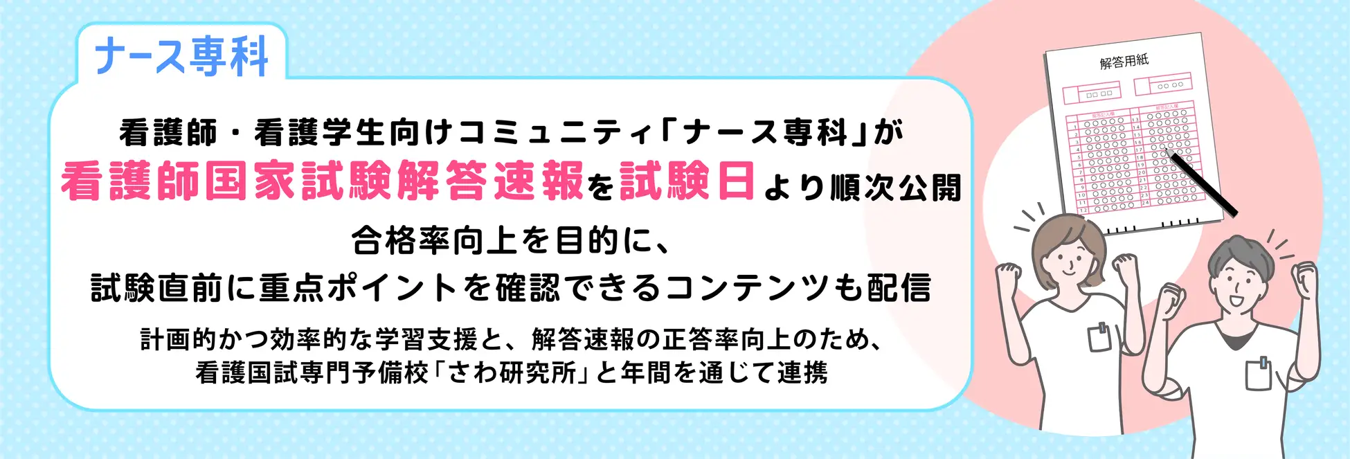 ナース専科は、看護師・看護学生向けコミュニティで、悩み相談ができる掲示板や最新の看護・医療ニュース、看護師国家試験対策などのスキル・キャリアアップ情報を提供。看護師・看護学生のキャリア形成をサポートしている。解答速報は、正答率向上のため、全国各地の看護大学・専門学校で受験対策講座を行う予備校「さわ研究所」と連携して実施している。
