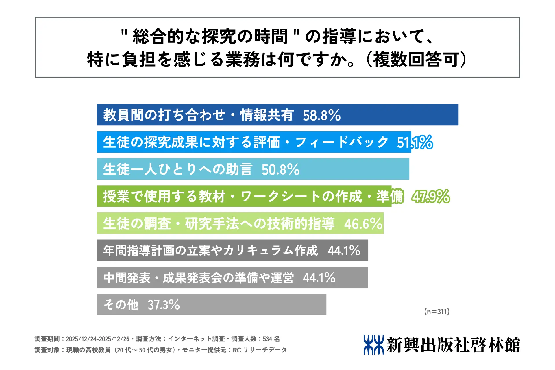 - 「総合的な探究の時間」の指導、高校教員の7割以上が「他の業務に比べ負担が大きい」と回答=新興出版社啓林館調べ=(2026年2月10日)