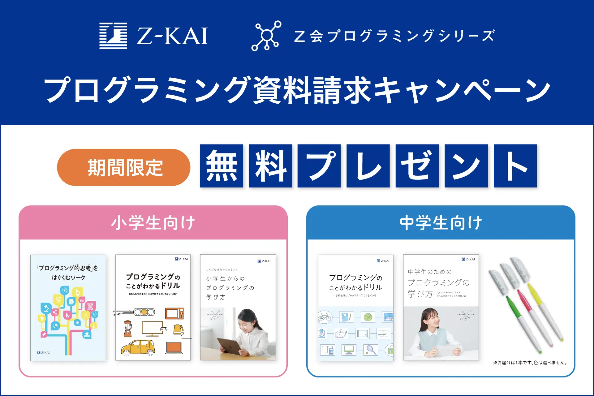 キャンペーン期間中に「Z会プログラミングシリーズ」の資料を請求した全員に、プログラミング学習のことがわかるZ会オリジナルの冊子とグッズを無料でプレゼントする。