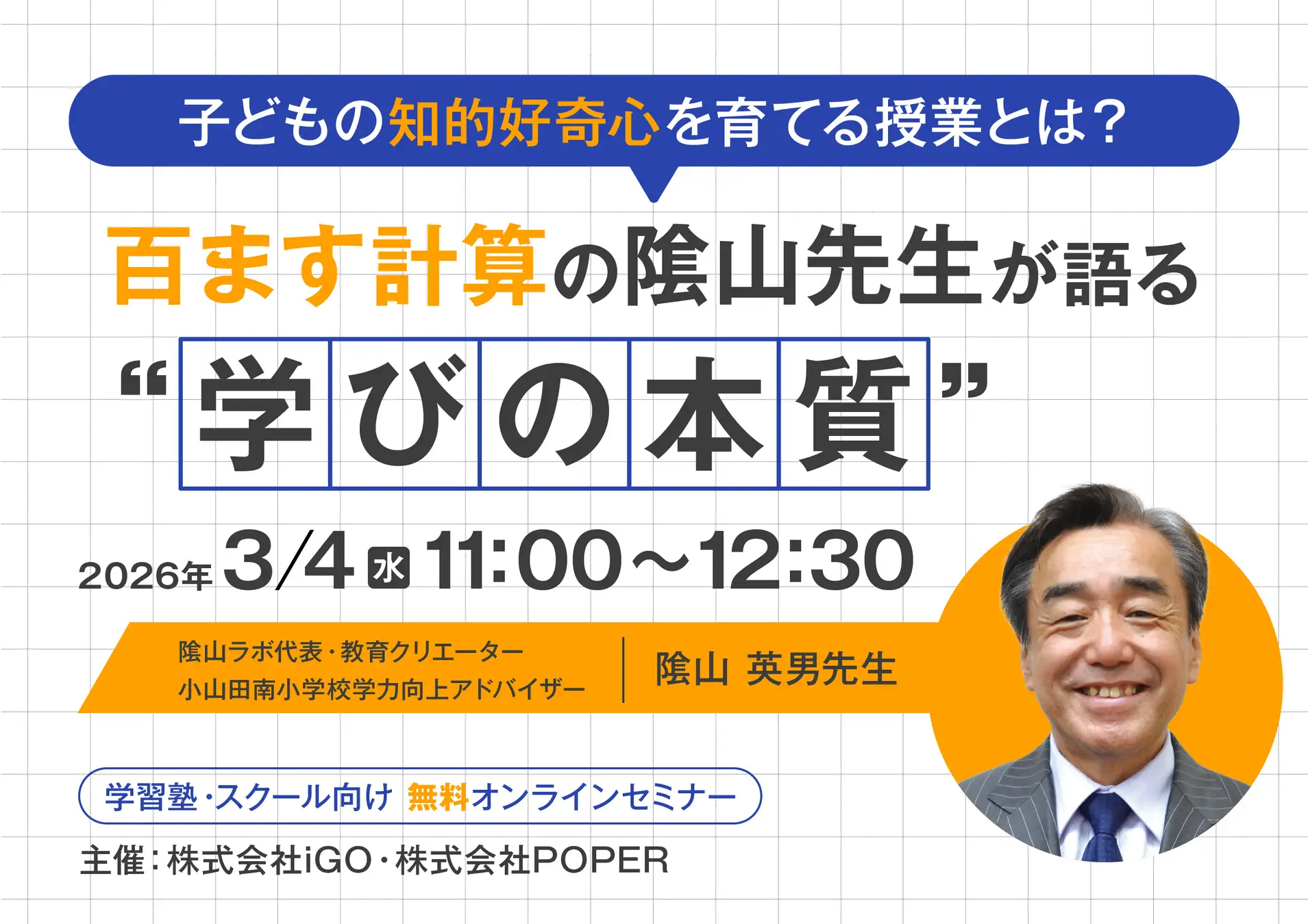 iGO(アイゴウ)は、POPERと共同で、塾・スクール運営者向けオンラインセミナー「子どもの知的好奇心を引き出す授業とは?」を、3月4日に無料開催する。