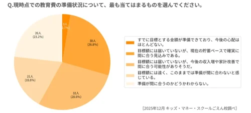 一方、準備状況では「未達だが改善すれば間に合う」が28.6%、「現在の貯蓄で間に合う」が26.8%と過半数が前向きな見通しを持つものの、「目標に届かず不安」とする層も約4割に達した。