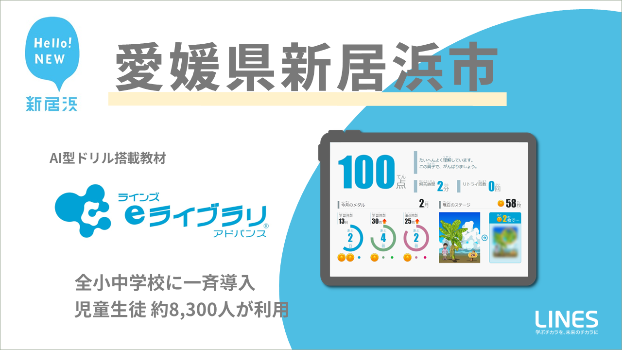 ラインズは12日、AI型ドリル搭載の学習支援サービス「ラインズeライブラリアドバンス」が、愛媛県新居浜市立の全小中学校に一斉導入されたと発表した。