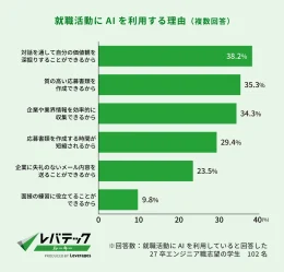 利用理由には「対話を通して価値観を深掘りできる」(38.2%)、「質の高い応募書類を作成できる」(35.3%)が挙がり、時短にとどまらず”思考ツール”としての活用が広がっている。