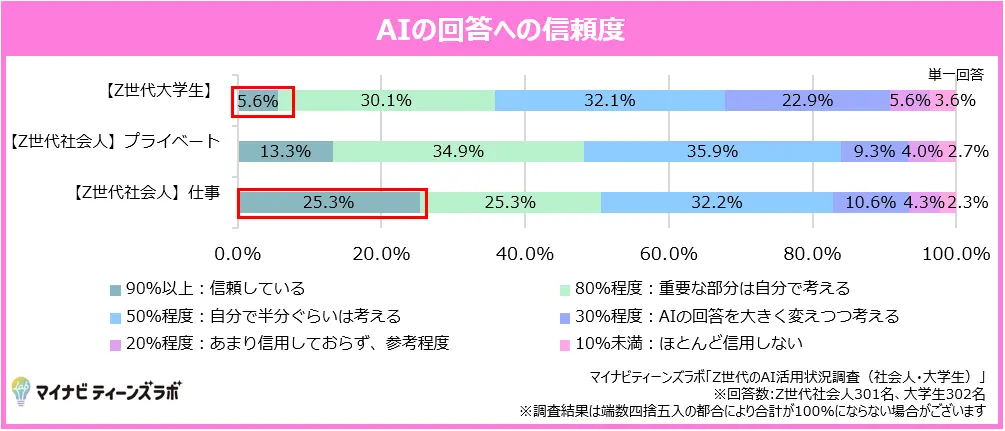 AIの回答を「信頼している」Z世代社会人は25.3%、大学生は5.6%=マイナビ調べ=
