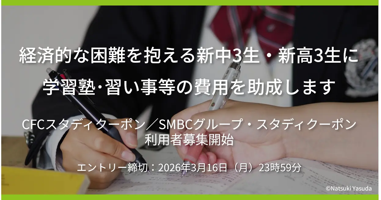 チャンス・フォー・チルドレン(CFC)は16日、経済困窮家庭の受験生を対象に、1人あたり15~30万円分のCFCスタディクーポンおよびSMBCグループ・スタディクーポンを無償提供する「スタディクーポン新規利用者」の募集を開始した。エントリーは3月16日まで。