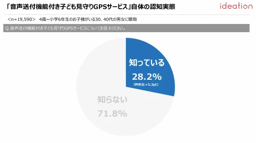 また、音声送付機能付き子ども見守りGPSサービス自体の認知率を見ると、「知っている」が28.2%と、前回調査結果の22.9%から5.3ポイント向上した。