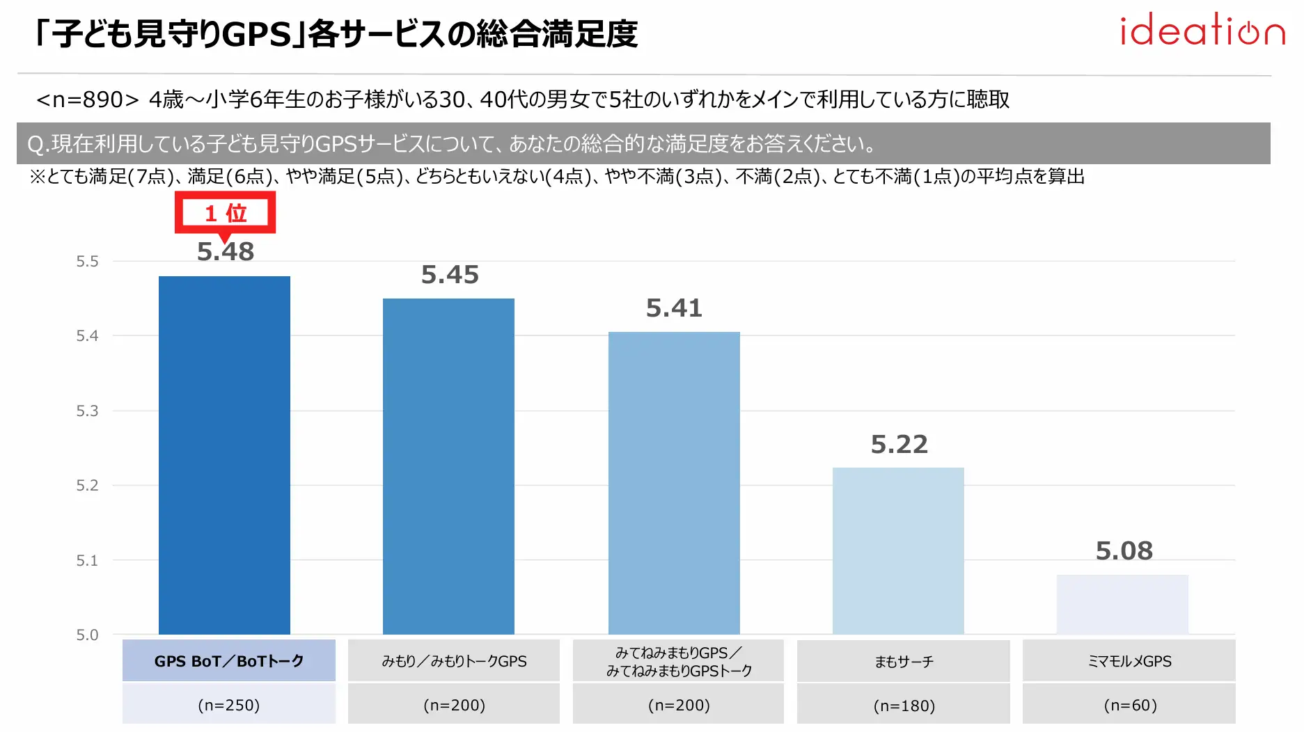 各サービスの利用率は、5年連続で「GPS BoT/BoTトーク」7.0%が1位で、「みてねみまもりGPS/みてねみもりGPSトーク」5.5%が2位だった。各サービスの総合満足度については、とても満足・満足・やや満足・どちらともいえない・やや不満・不満・とても不満の7段階で質問し、平均点を算出した結果、「GPS BoT/BoTトーク」5.48点が1位となり、他サービスと比較して、満足度が高いことが見て取れる。