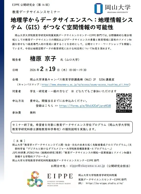 岡山大学は、教育データサイエンスセミナー「地理学からデータサイエンスへ:地理情報システム(GIS)がつなぐ空間情報の可能性」(第14回EIPPE公開研究会)を、2月19日に開催する。