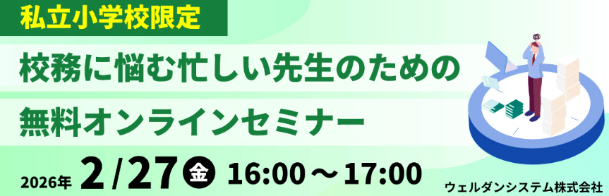 ウェルダンシステムは、私立小学校教職員対象の無料オンラインセミナー「校務に悩む忙しい先生のための無料オンラインセミナー」を2月27日に開催する。
