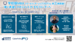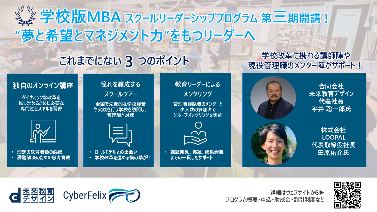 サイバーフェリックスは16日、未来教育デザインと、学校経営スキル養成プログラム「学校版MBAスクールリーダーシッププログラム」第3期の申込受付を開始した。