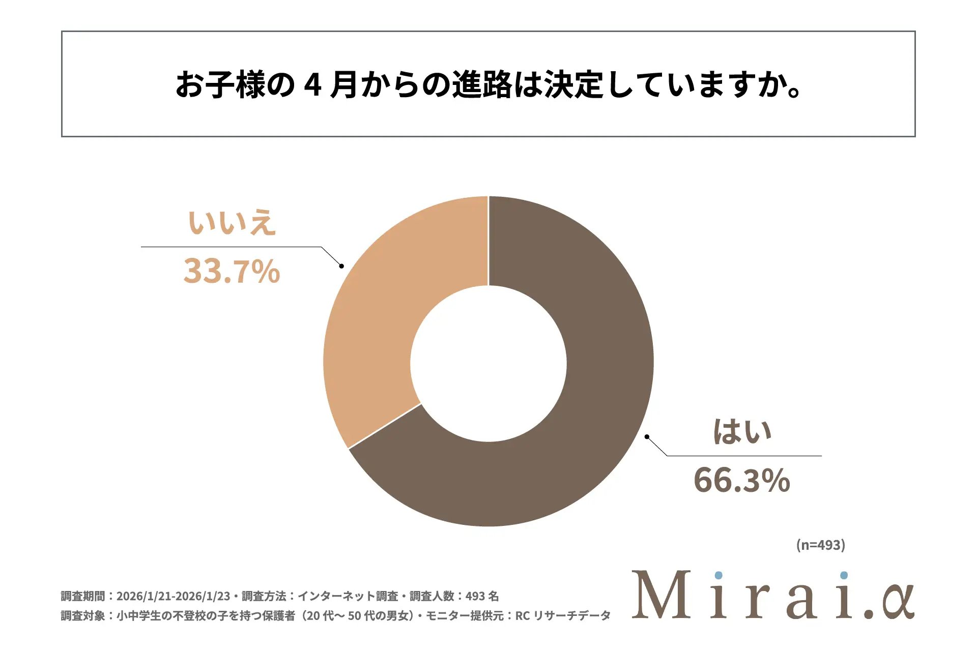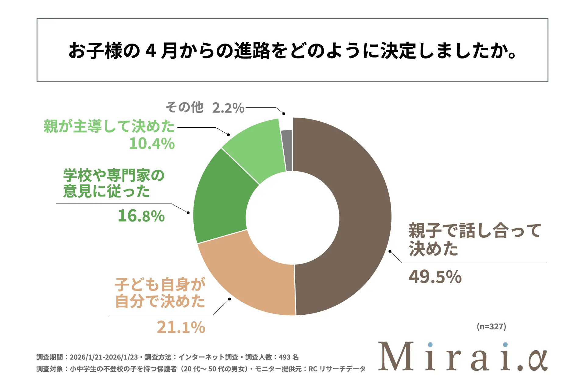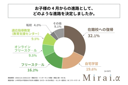 Mirai.yが運営するオンラインフリースクール「Mirai.α」は17日、不登校の小中学生を持つ保護者が考える、子どもの4月からの進路に関する調査の結果を公表した。