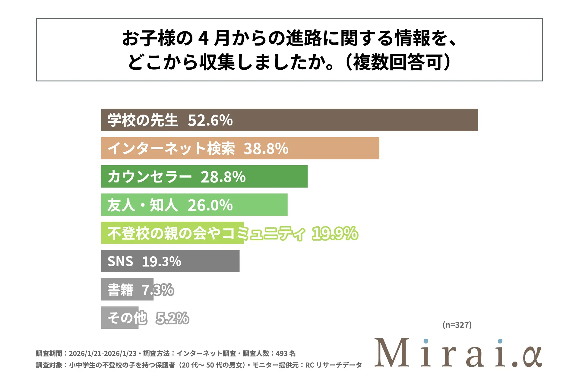 - 不登校の子どもの進路の情報収集で親が最も課題に感じるのは、子どもに合う選択肢がわからないこと=Mirai.y調べ=(2026年2月18日)