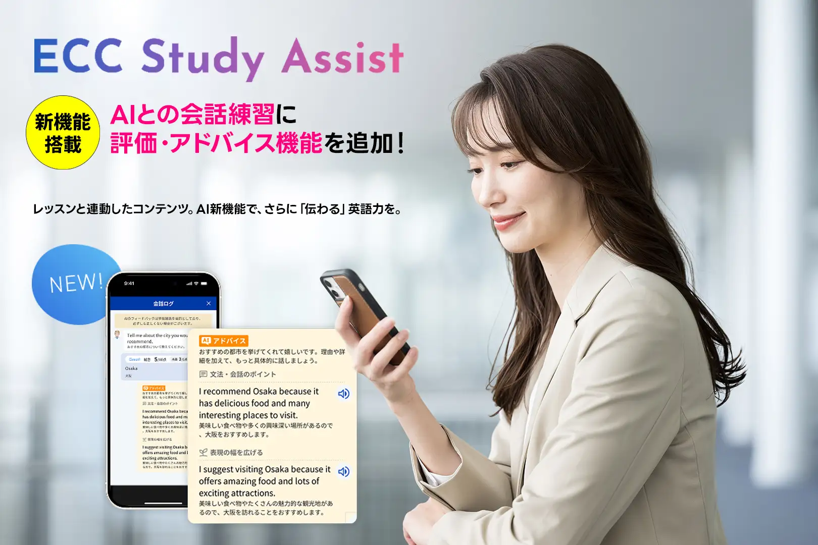 ECCが運営するECC外語学院は、「初級~中級英会話コース」に導入しているECCの学習支援アプリ「ECC Study Assist」に新機能「AI評価・アドバイス機能」を4月1日から追加搭載する。