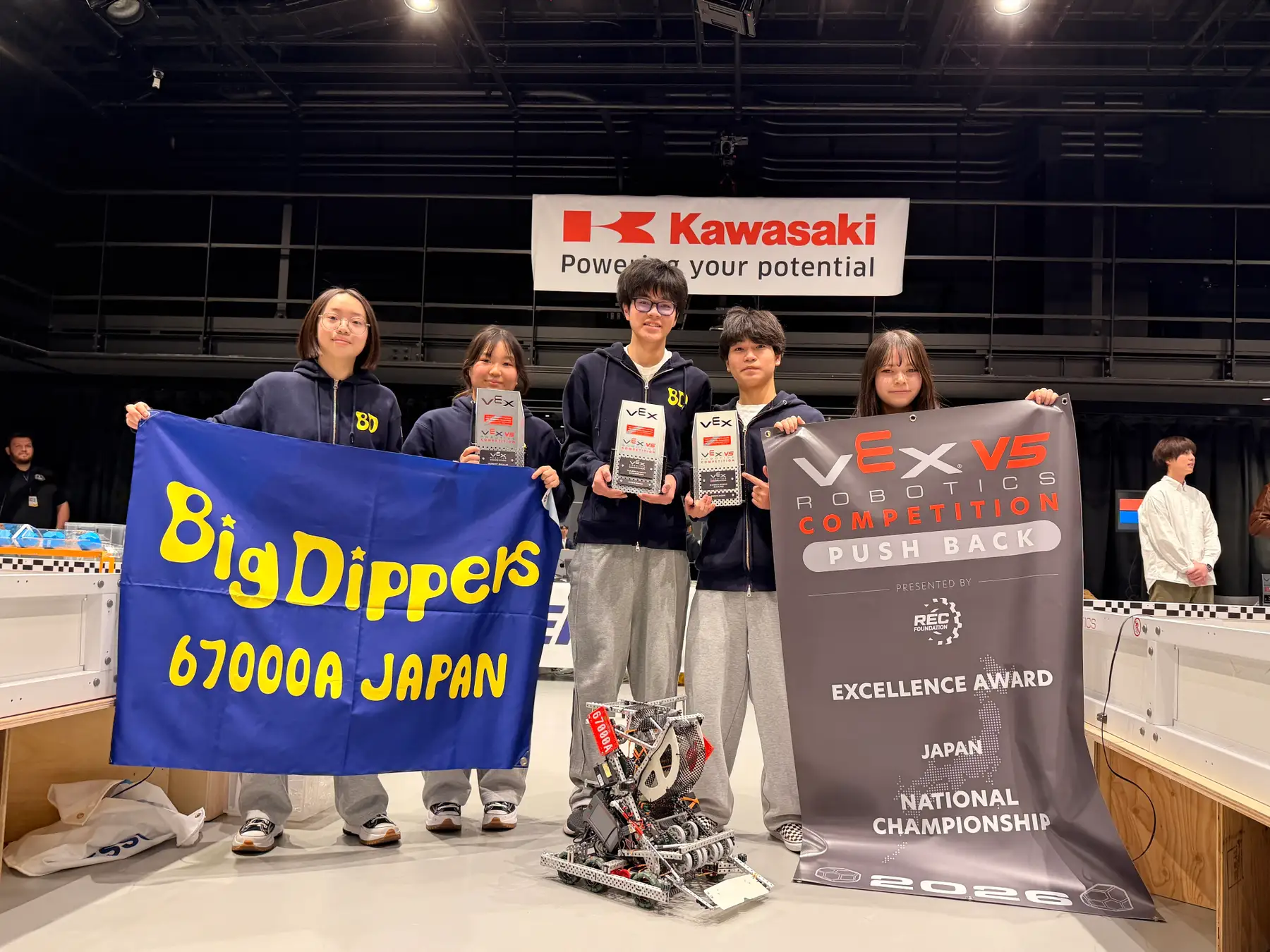 今シーズンは5人体制での挑戦で、5人のうち3人は女子中高生。ロボティクス分野では少数派になりがちな女子メンバーが、設計・プログラミング・記録・広報など各領域で男子メンバーと同様に中心的役割を担った。限られた人数の中で役割を再定義し、開発プロセスと検証サイクルを再設計したことが、3冠達成につながったという。