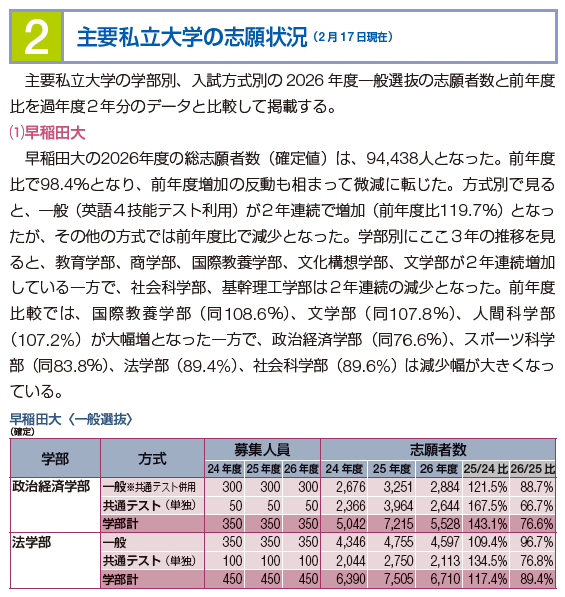 早稲田大学は総志願者数9万4438人で前年度比98.4%と微減。方式別では英語4技能テスト利用の一般選抜が2年連続で増加(前年度比119.7%)した。学部別では教育学部、商学部、国際教養学部、文化構想学部、文学部が2年連続で増加する一方、社会科学部や基幹理工学部は2年連続減少となった。