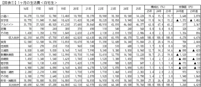 それによると、自宅生の「収入合計」は7万2648円と4278円増加した。一方、「支出合計」は7万760円で1260円増だった。収入増のほうが支出増よりやや大きく、貯金・繰越金は微増だった。