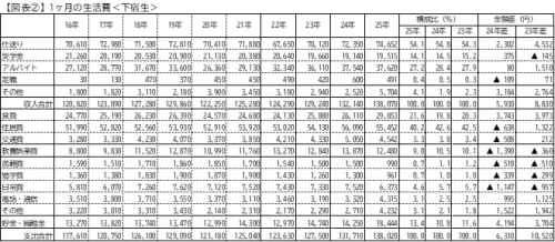 支出構造では、食費が増加する一方、交通費・教養娯楽費の抑制、学習関連支出(書籍・勉学費)の低下がみられた。とくに書籍費は2016年以降はじめて1000円を下回った。