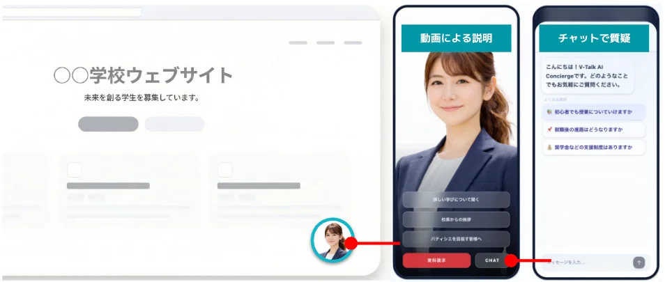 少子化の進行に伴い学生募集競争が激化するなか、多くの学校法人ではウェブサイトへのアクセスはあるものの、資料請求やオープンキャンパス予約など次のアクションにつながらないという課題を抱えている。同サービスは、学校公式サイトにコードを埋め込むだけで、スマートフォンサイズの動画プレーヤーとAIチャットボットをポップアップ表示できるSaaS型ツールで、こうした課題の解消を目指す。