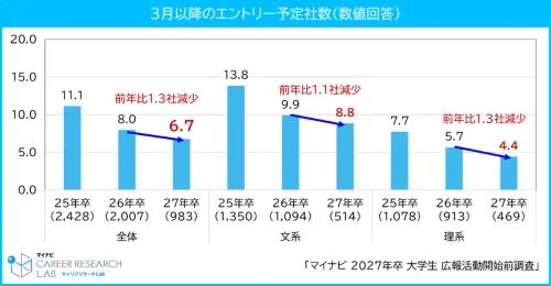 一方、3月以降にエントリー予定の社数は全体で平均6.7社となり、前年から1.3社減少。文系は8.8社、理系は4.4社でいずれも減少傾向にある。インターンシップ等の活動を通じて志望企業を絞り込む動きが強まり、いわゆる「ピンポイント就活」の傾向が加速しているとみられる。