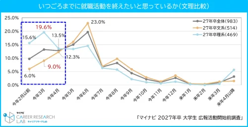 就職活動を終えたい時期は「6月」が19.7%で最多だが、理系では「3月」が19.6%で最も多く、文系との差が見られた。