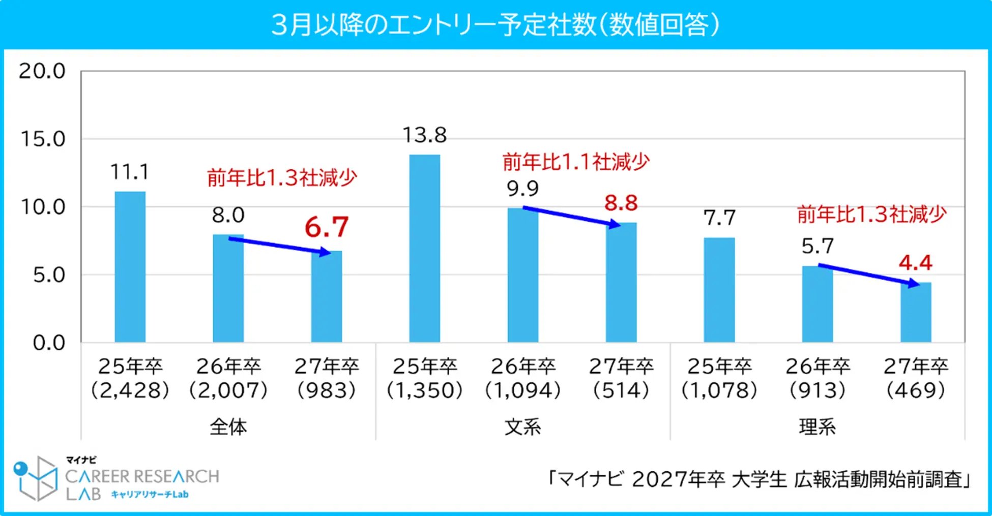一方、3月以降にエントリー予定の社数は全体で平均6.7社となり、前年から1.3社減少。文系は8.8社、理系は4.4社でいずれも減少傾向にある。インターンシップ等の活動を通じて志望企業を絞り込む動きが強まり、いわゆる「ピンポイント就活」の傾向が加速しているとみられる。