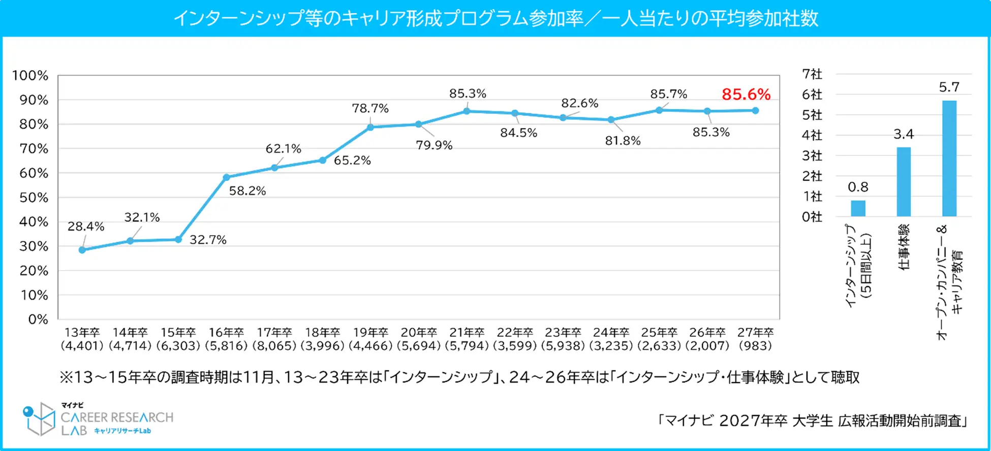 - 27年卒学生のインターンシップ等のキャリア形成プログラム参加率は85.6% =マイナビ調べ=(2026年2月27日)