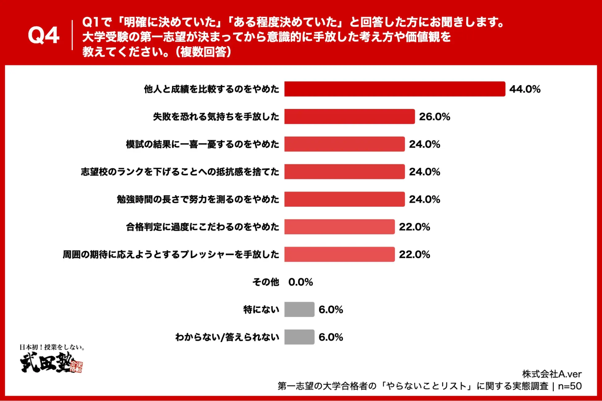 さらに、第一志望が決まってから意識的に手放した考え方や価値観を訊ねたところ、「他人と成績を比較するのをやめた」が最も多くなった。