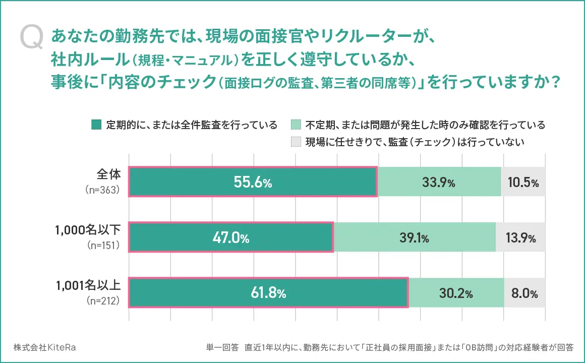 企業の55.6%が、面接・面談・OB訪問等の「内容のチェック(面接ログの監査、第三者の同席等)」を定期的に、または全件で実施(1001名以上:61.8%/1000名以下:47.0%)していることがわかった。