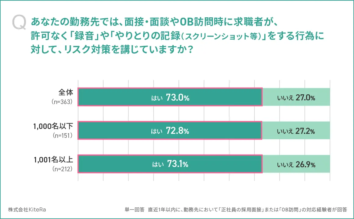 企業の61.7%が、一部の求職者が面接・面談やOB訪問時に許可なく録音したり記録されることを想定しており、実際にされたことがあるとわかった。企業の73.0%が、求職者による「許可なく録音/記録」に対するリスク対策を講じている。