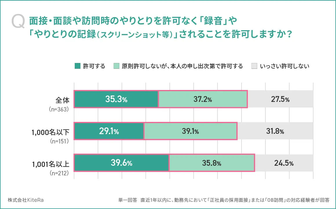 求職者による無断録音・記録の扱いは、「原則許可しないが申し出次第で許可」37.2%、「許可する」35.3%、「いっさい許可しない」27.5%と企業で分かれることが判明した。