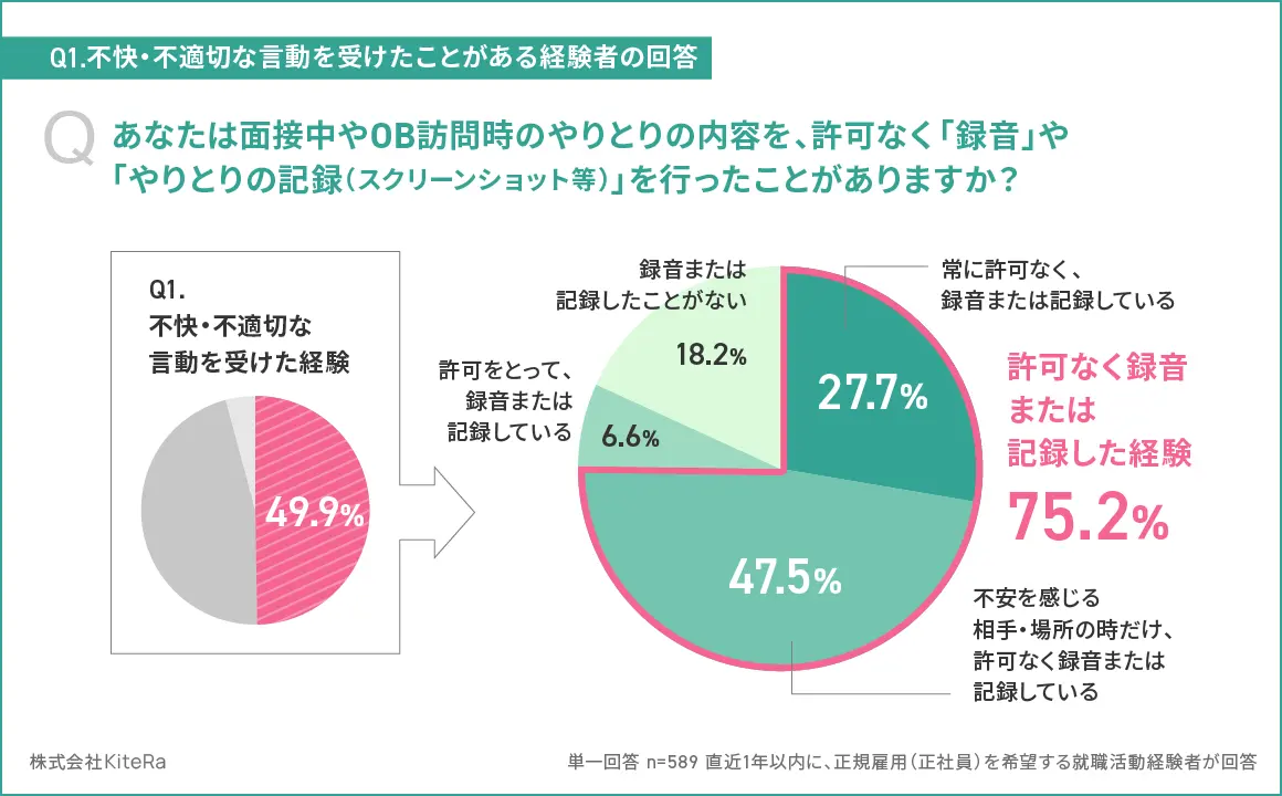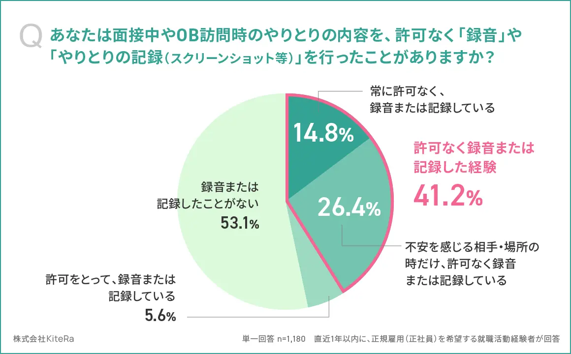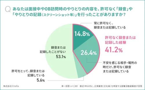 求職者全体の41.2%、また「明確なセクハラ/不快・不適切な言動」を受けたと回答した人の75.2%が、面接・OB訪問時に許可なく録音または記録したことがあると判明した。