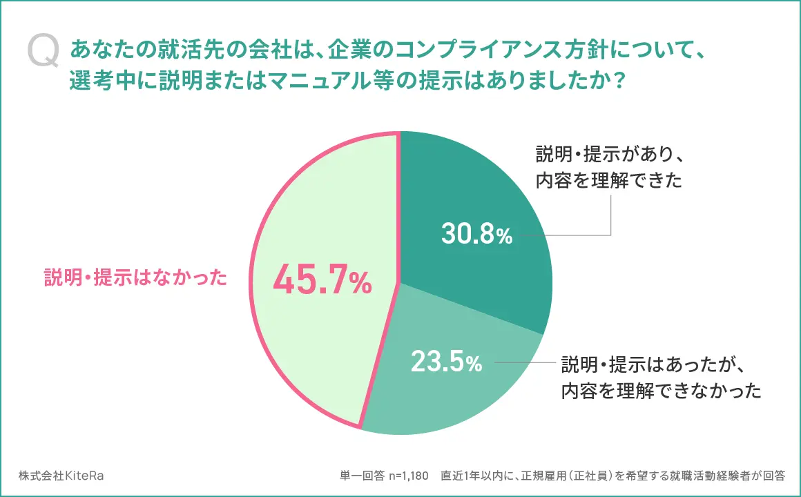 選考中に起きたハラスメントについて相談できる窓口が「ない」の回答は54.5%。企業のコンプライアンス方針について、選考中の説明・マニュアル提示が「なかった」の回答は45.7%だった。