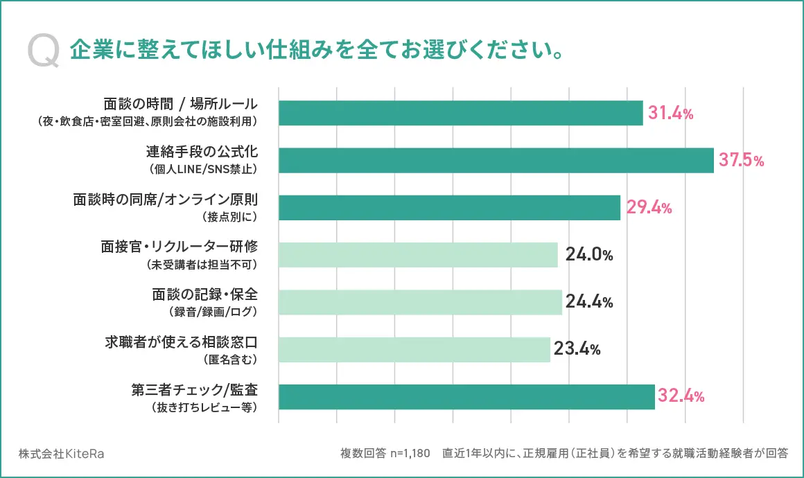 求職者が企業に整えてほしい仕組みの上位は、「連絡手段の公式化」37.5%、「第三者チェック/監査」32.4%、「面談の時間/場所ルール」31.4%となった。