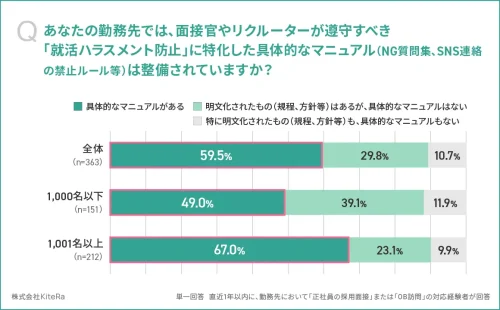 企業の59.5%が「就活ハラスメント防止」に特化した具体的なマニュアルを整備(1001名以上:67.0%、1000名以下:49.0%)している。