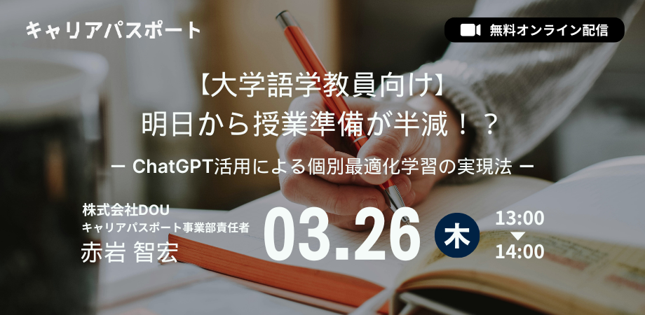 DOUは、オンラインセミナー「【大学語学教員向け】 明日から授業準備が半減!?ー ChatGPT活用による個別最適化学習の実現法 ー」を3月26日に開催する。