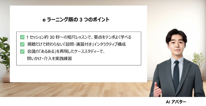 eラーニング版では、1セッション約30秒からの短尺レッスンで構成し、設問・演習付きのインタラクティブな形式を採用。会議で起こりがちな場面を再現したケーススタディーを通じ、問いかけや介入の実践練習を行う。学習時間は3時間、定価は2万2000円(税込)。顧客や社内外のステークホルダーとの円滑な対話を必要とするビジネスパーソンを対象とし、前提知識は不要としている。