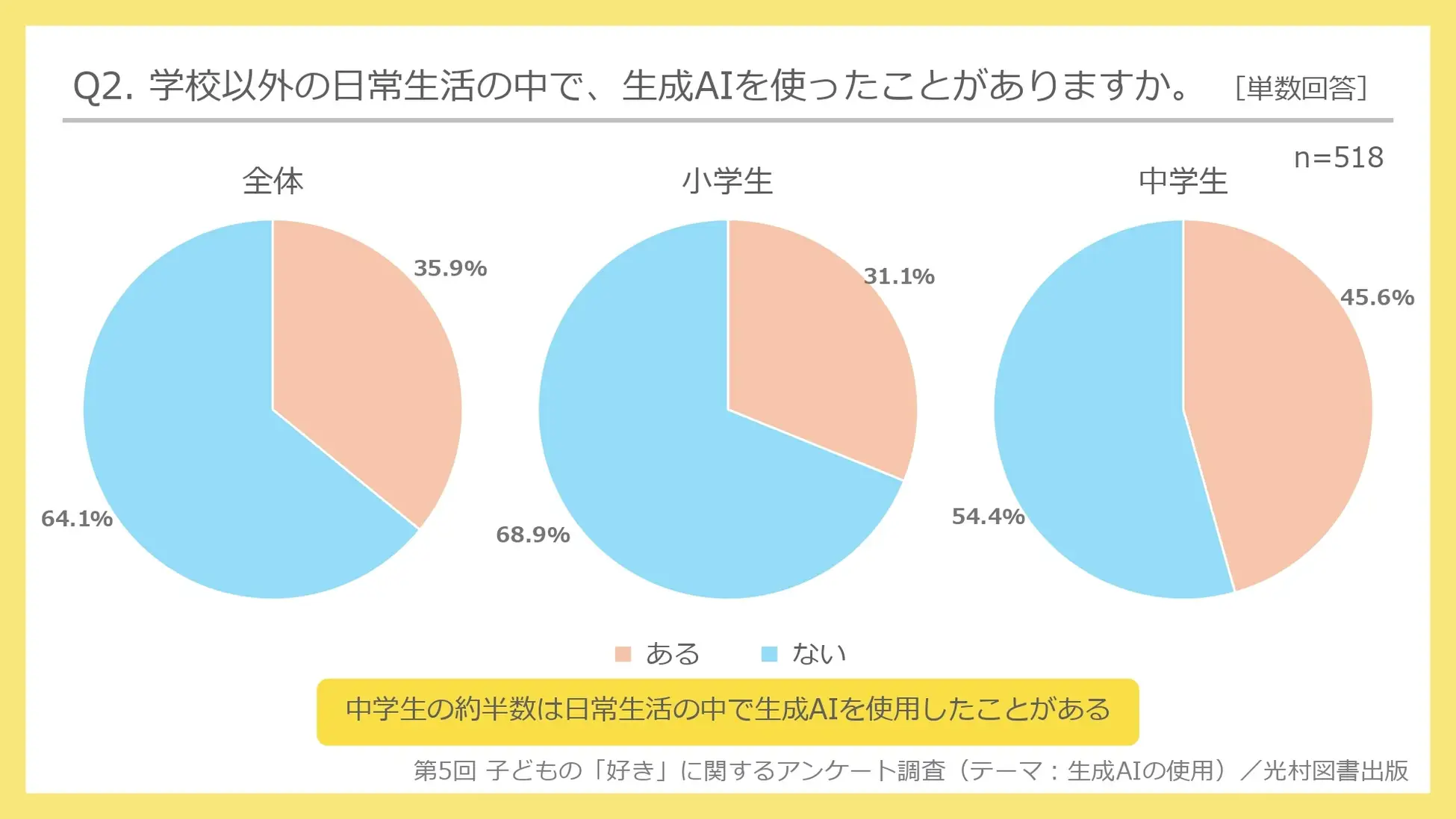 小学生と中学生を比べると、「ある」と回答した割合は小学生が31.1%、中学生が45.6%となり、中学生のほうが14.5pt高かった。中学生の約半数が日常生活でAIを使用していることが分かった。