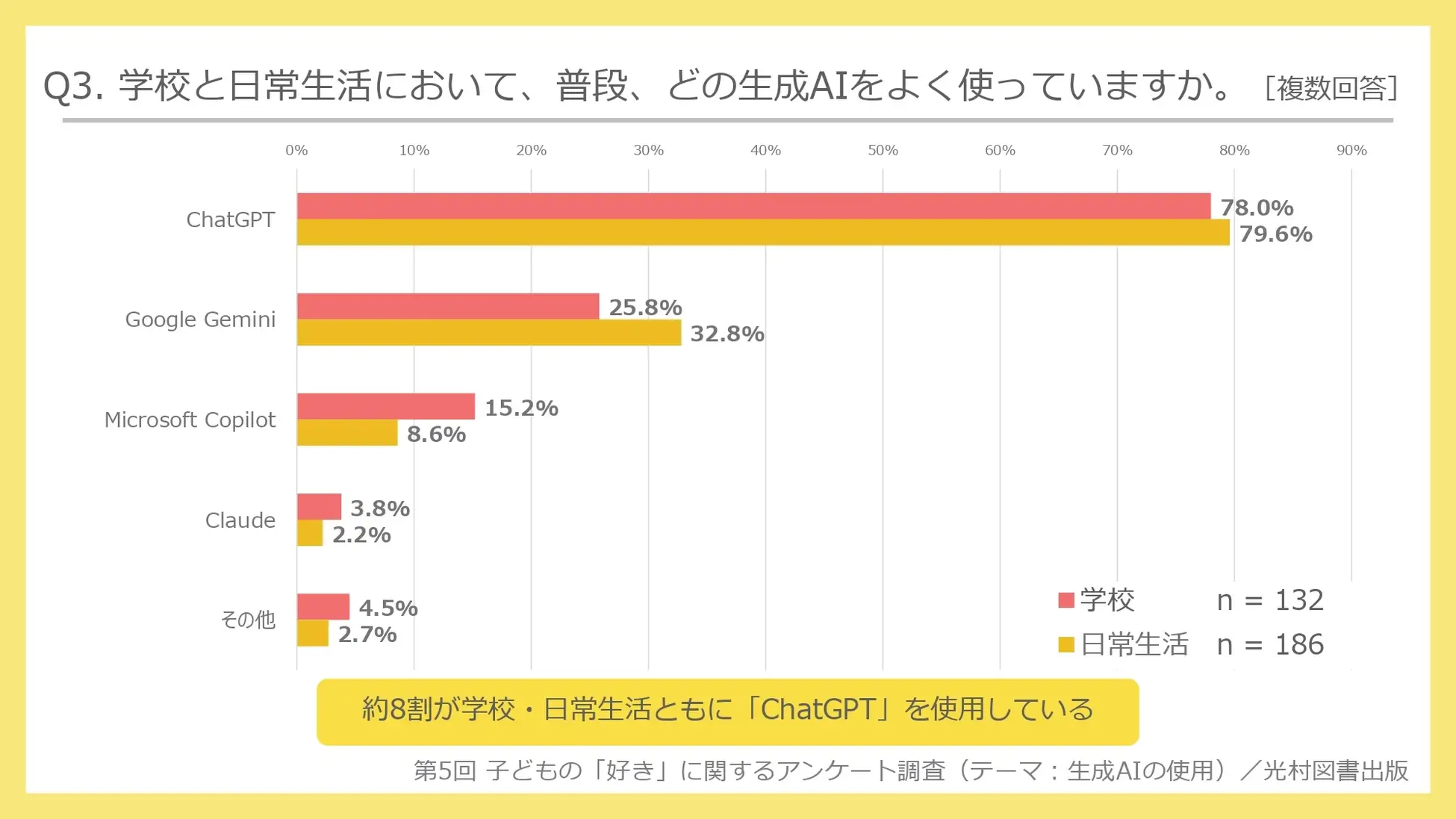 次に、「学校と日常生活で、普段、どの生成AIをよく使っているか」と聞いたところ、 全体では、「学校」「日常生活」ともに、「ChatGPT」が最も多く約8割に達した。2位の「Google Gemini」は約3割にとどまった。