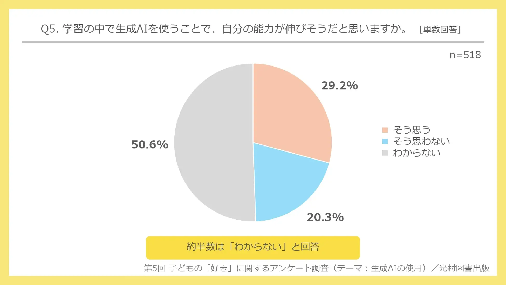 また、「学習(学校での学習も家庭学習も含める)で生成AIを使うことで、自分の能力が伸びそうだと思うか」と尋ねたところ、「分からない」が50.6%と最も多かった。「そう思う」は29.2%で、「そう思わない」の20.3%を8.9pt上回った。