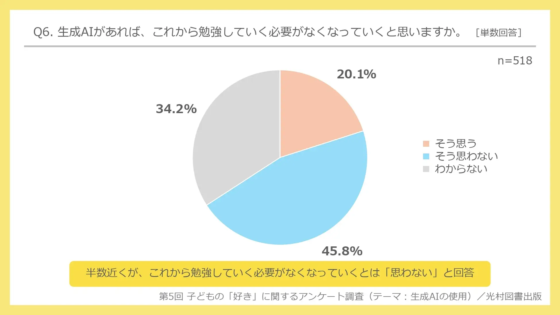 さらに、「生成AIがあれば、これから勉強していく必要がなくなっていくと思うか」と聞いたところ、「そう思わない」が45.8%と半数近くなり、「そう思う」の20.1%を25.7pt上回った。