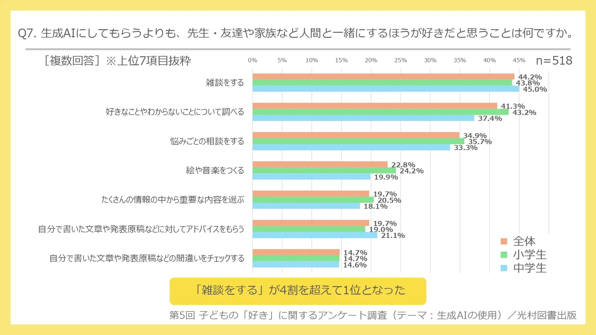 最後に、「生成AIにしてもらうよりも、教師・友達や家族など人間と一緒にするほうが好きだと思うこと」を尋ねたところ、全体では、「雑談をする」44.2%が最も多く、次いで「好きなことや分からないことについて調べる」41.3%、「悩みごとの相談をする」34.9%となった。